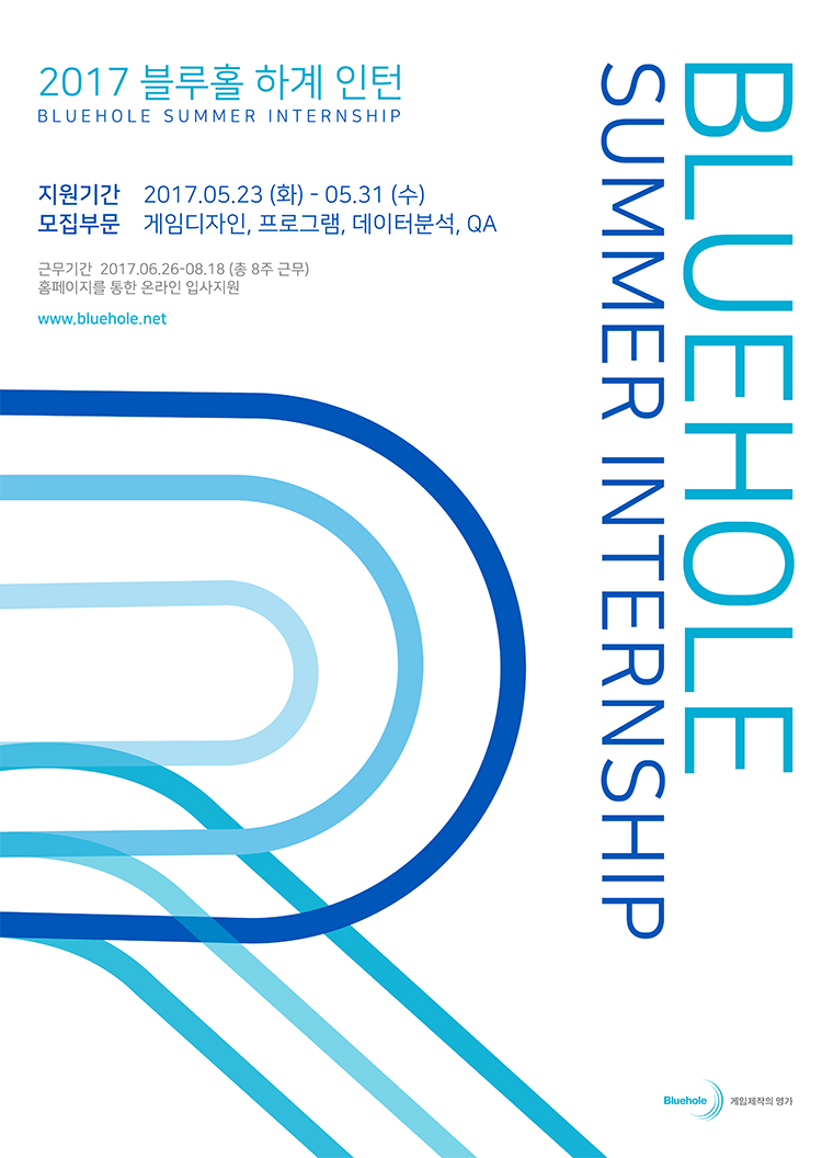 블루홀, 2017년 하계 인턴사원 모집“글로벌 게임 ‘테라’, ‘배틀그라운드’를 잇는 차세대 게임 개발자를 모십니다!”블루홀(대표 김강석)이 2017년도 하계 인턴사원을 모집한다고 금일(23일) 밝혔다.모집기간은 5월 23일(화)부터 5월 31일(수)까지이며 블루홀 공식 홈페이지(https://www.bluehole.net)에서 온라인 지원이 가능하다. 모집 부문은 게임 기획, 프로그램,