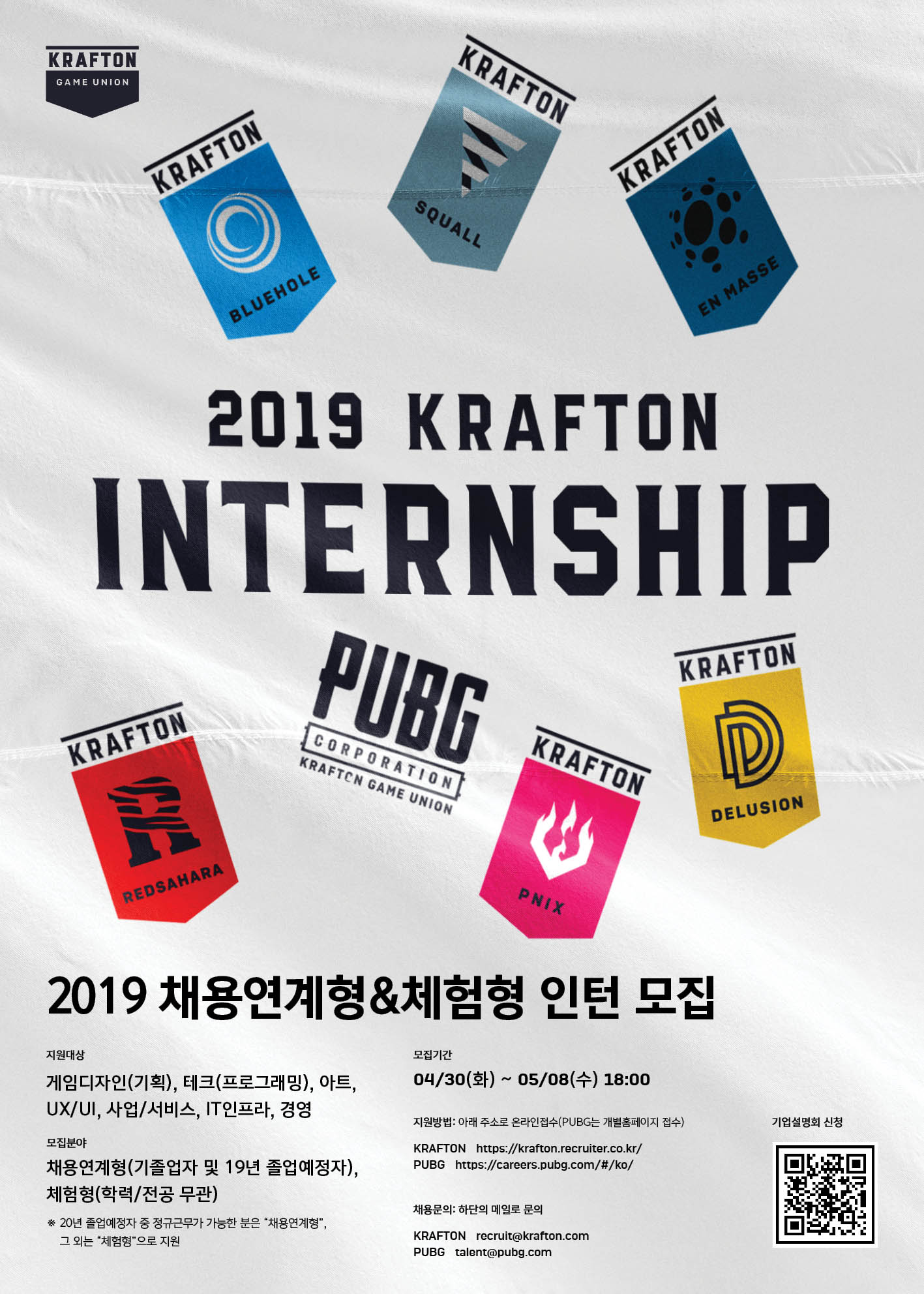 -       4월 30일부터 5월 8일까지 원서 접수-       게임디자인, 테크, 아트, 사업/서비스, 경영 등 8개 분야 모집-       5월 3일 판교 본사에서 인턴십 기업설명회 진행 [2019년 4월 30일] 크래프톤이 2019년도 하계 인턴사원을 모집한다. 모집기간은 4월 30일 오전 10시부터 5월 8일 오후 6시까지다. 인턴사원을 모집