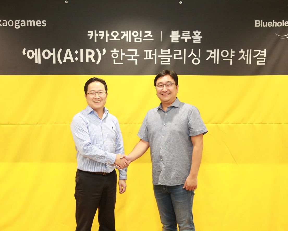 - 카카오게임즈-블루홀, PC MMORPG ‘에어(A:IR)’ 한국 퍼블리싱 계약 - 북미-유럽 퍼블리싱에 이어, 한국 서비스 계약 확정. 성공적인 개발 및 서비스 다짐 글로벌 멀티플랫폼 게임기업 ㈜카카오게임즈(각자 대표 남궁훈, 조계현)는 11일(목), ㈜블루홀(대표 김효섭)이 개발 중인 블록버스터 MMORPG ‘에어(A:IR – Ascent: Infinite Realm)’의 한국 퍼블리싱 계약을 체결했다.&n
